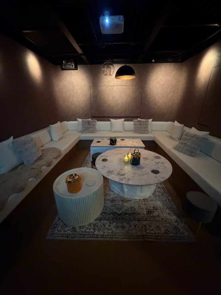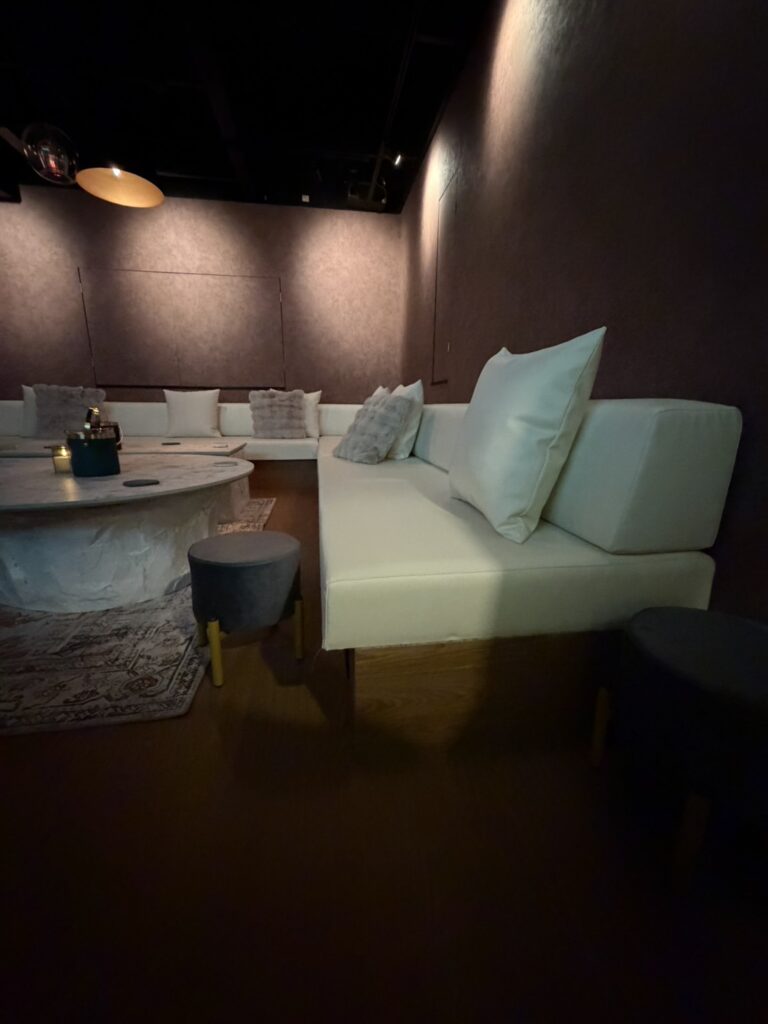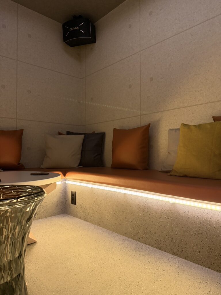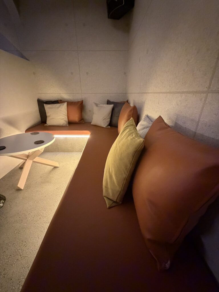 角型の低めの背もたれ、手前色違いのクッションを並べて素敵な空間になっております。